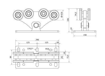 Nosný vozík pre samonosnú posuvnú bránu do hmotnosti 700kg a maximálnej svetlosti prejazdu 8m. Vozík je určený pre použitie so šínou (c profilom) typu C95FE.RG/C95Z.RG - STAGE MB, STAGE MZ .