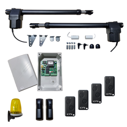 Kompletná sada pohonu pre krídlovú bránu max. šírka krídla 4m do hmotnosti jedného krídla 350kg. Pohony sú napájané 230V. Veľmi kvalitný pohon krídlovej brány, ktorého telo je vyrobené zo zliatiny hliníka. Piestnica pohonu je vyrobená z nerezovej ocele, vo vnútri ktorej je uložená oceľová skrutkovice pohonu. Pohony sú vybavené mechanickým odblokovaním pomocou odblokovacieho kľúča v prípade výpadku prúdu.